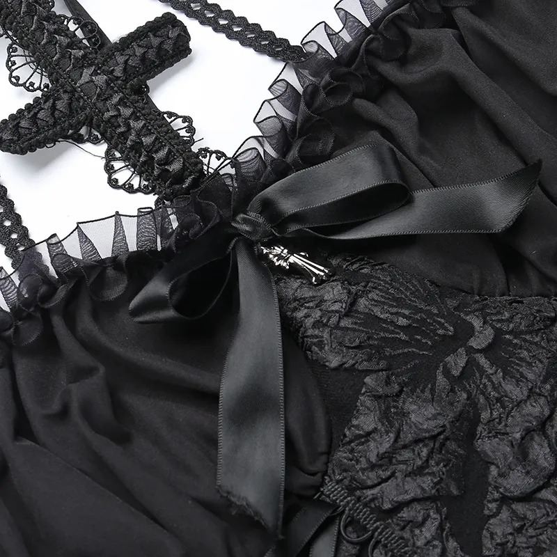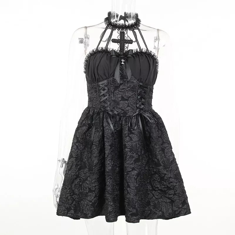 Cette robe n’est pas juste un vêtement, c’est une porte ouverte sur un monde où la sensualité sombre et la féminité règnent en maîtres. Le dos nu et le laçage ajustable offrent un jeu de séduction et de personnalisation, permettant à celle qui la porte de s’exprimer pleinement. Que ce soit pour une soirée à thème, un bal gothique ou tout simplement pour affirmer votre style unique, cette robe est un incontournable.